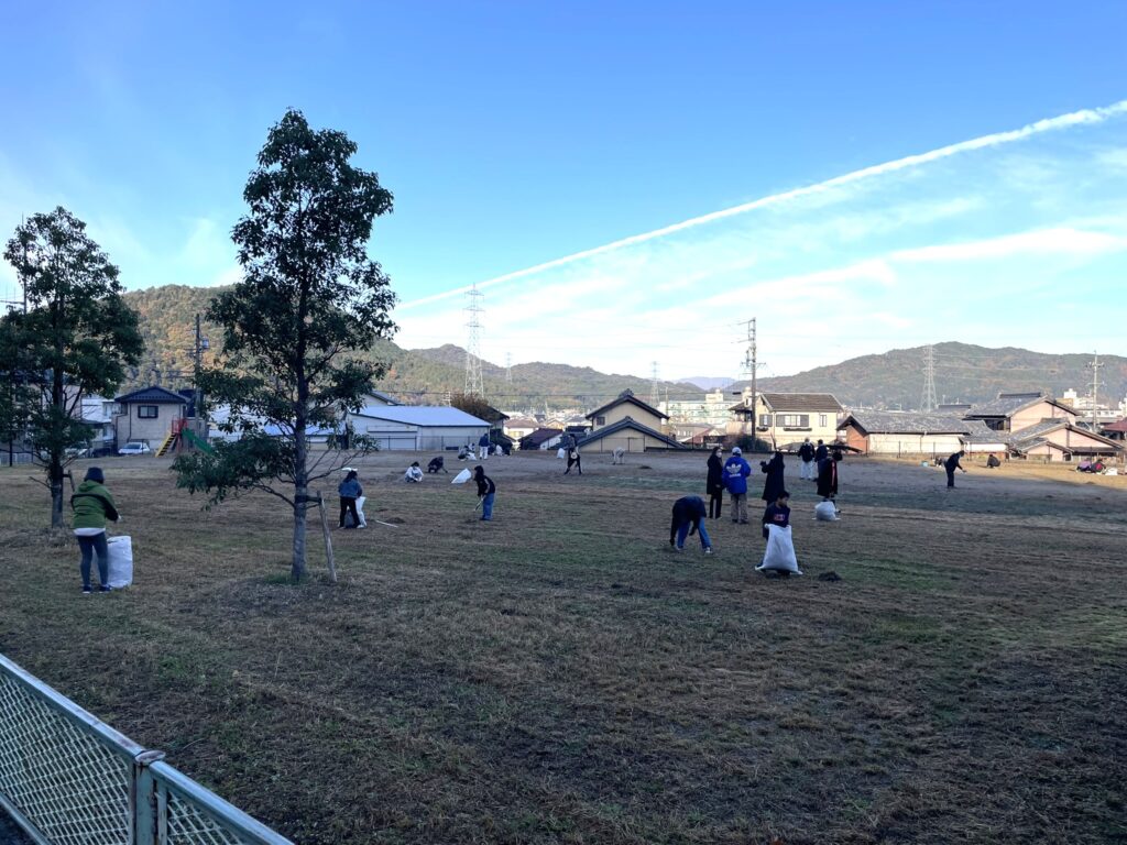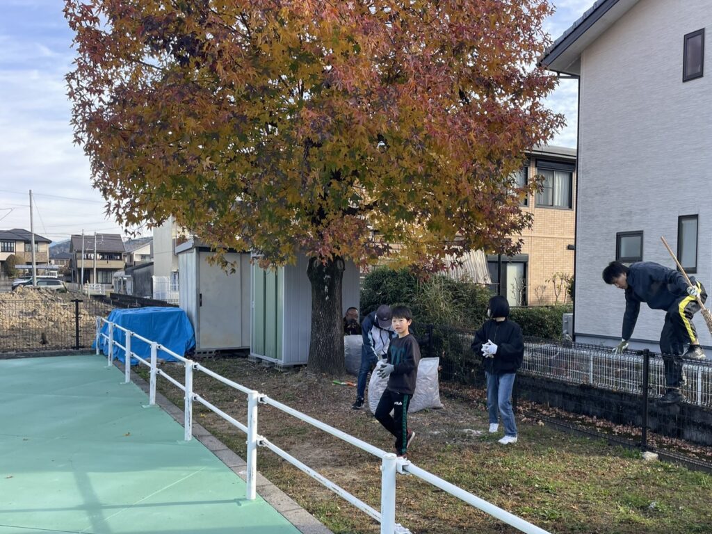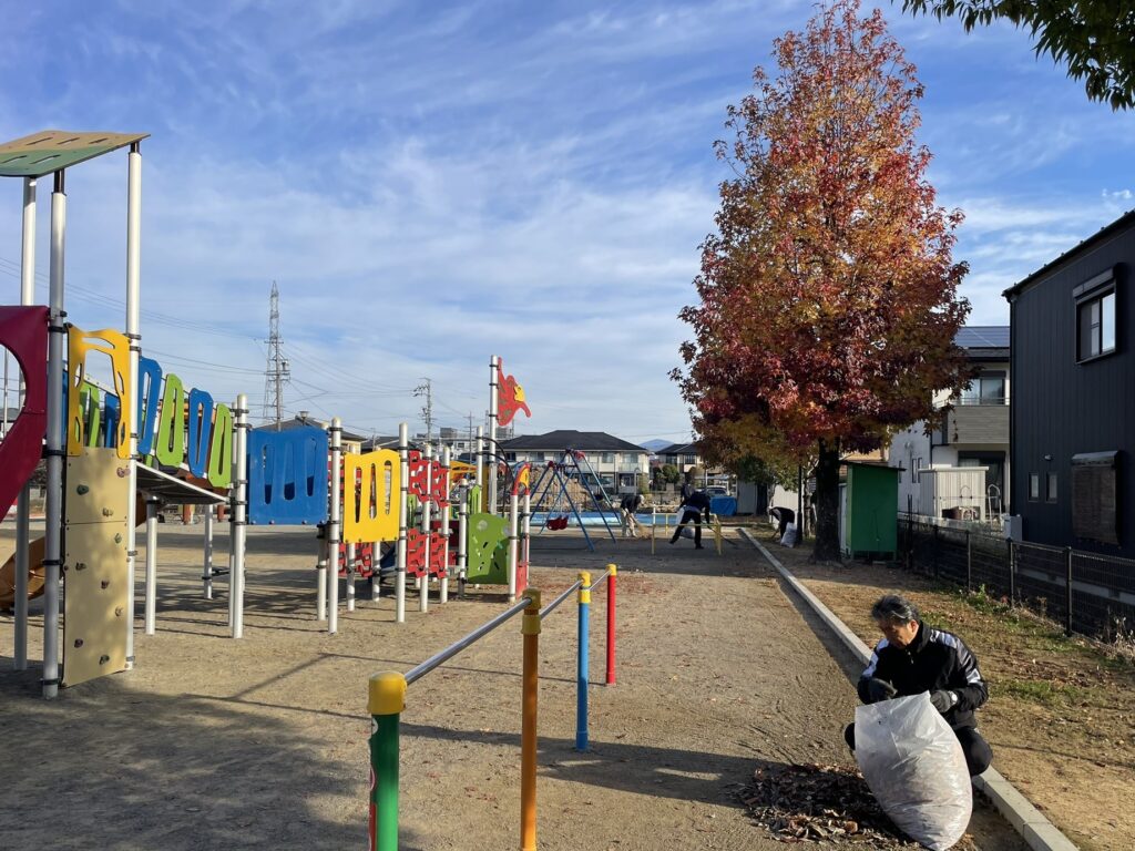 続く24日には上岩崎自治会が上岩崎公園周辺で市民一斉清掃を行いました。参加者は公園内の落ち葉を手分けして回収し、遊具周りの安全点検も兼ねながら丁寧に整備作業を行いました。親子で参加された家庭も多くありました。