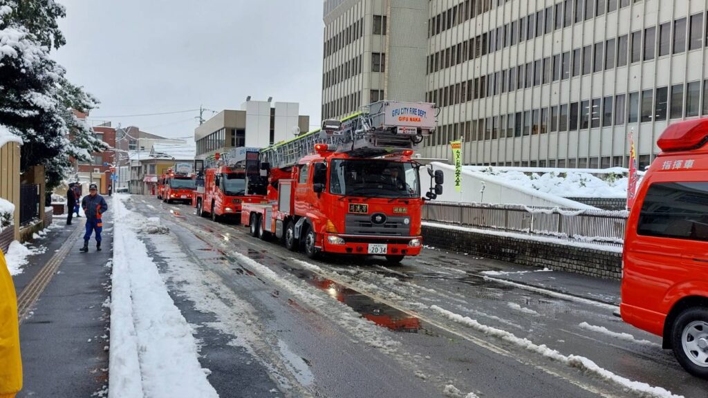 令和8年1月12日(月)、岐阜市立岐阜中央中学校第2運動場において、令和8年岐阜市消防出初式が開催され、岩野田消防団が参列しました。前日からの降雪により、会場一帯は厳しい寒さに包まれる中での式典となりましたが、消防関係者は規律正しく整列し、新年の決意を新たにしました。