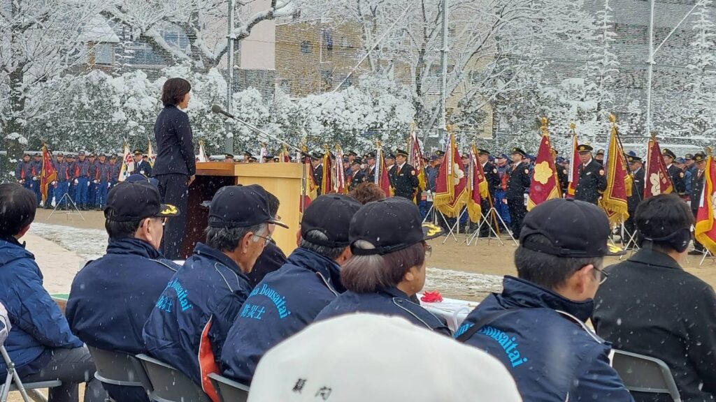 出初式では、消防職員・消防団員による分列行進や式典が行われ、地域防災を担う消防の使命と重要性を改めて確認する機会となりました。雪の舞う厳しい環境下においても、地域の安全・安心を守るため日頃から訓練を重ねている消防団員の姿は、非常に頼もしく感じられました。
